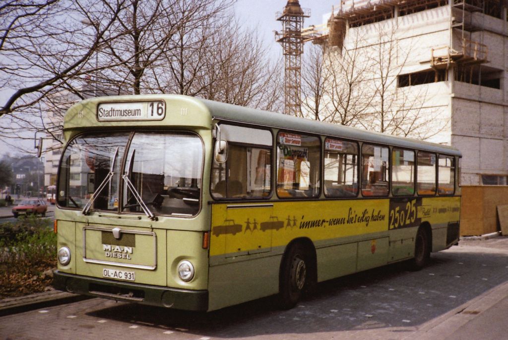 Wagen 122, OL-AC 942, EZ: 1971. Lange angekündigt, kann ich ihn jetzt endlich zeigen. Eine Aufnahme von Wagen 122 mit seiner zweiten Werbung. Zusammen mit den Wagen 120 und 121 hatte der Bus ursprünglich die alten Setra ST 110 Wagen 42, 44 und 48 mit Werbug für ASTRA-Bier abgelöst. Als später die Werbung für ASTRA-Bier verändert wurde, bekam Wagen 122 Werbung für JEVER-Pilsener. Friesich herb, aber mit seinem beigen Untergrund und dem dunkelgrünen JEVER-Schriftzug sehr harmonisch zur Wagenfarbe präsentierte sich der Bus von nun an bis zu seinem Ausscheiden im Jahr 1981. Diese Aufnahme machte Werner Striepling im September 1980. Zu dieser Zeit hatte der Bus bereits einiges mitgemacht. Davon zeugen die zusätzlichen Verstrebungen an den Seitenplanken. Die kurze vorne zwischen Tür und Radkasten hatten auch andere Busse dieses Typs bereits nach kurzer Zeit bekommen. Die beiden horizontalen und vertikalen Leisten hinter der zweiten Achse sind ebenfalls nicht original und deuten auf entsprechende Ausbesserungen hin.