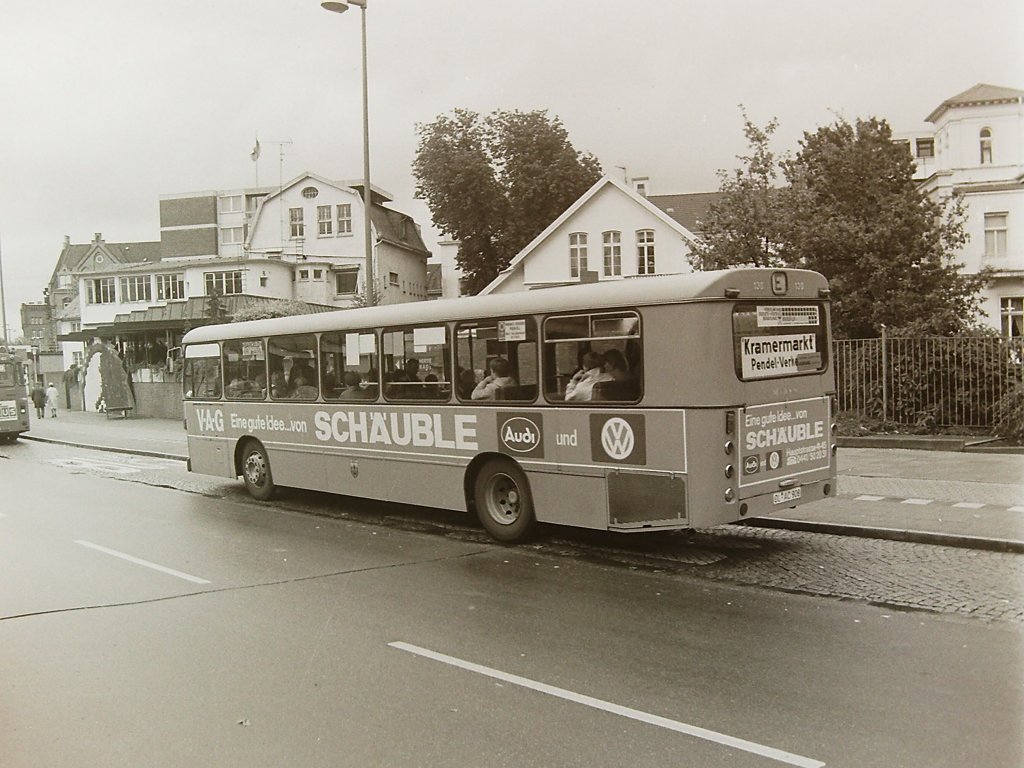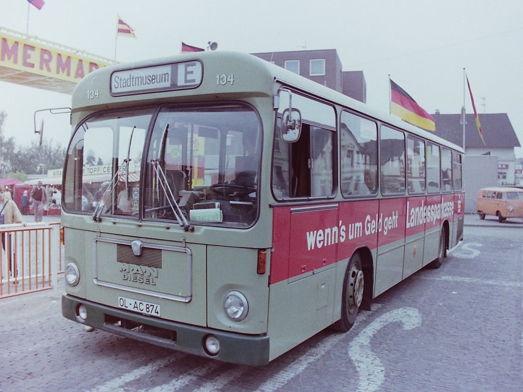 Wagen 131, OL-AC 871, EZ: 1973. Das einzige Foto des Busses in meinem Besitz. Entstanden am 07.10.81 im Kramermarkt-Pendelverkehr am Staugraben, wo eine "temporäre Haltestelle" eingerichtet war. Die Haltestellenschilder waren auf ausrangierte Felgen aufgeschweist. Dadurch waren sie zum einen sehr standfest, konnten bei Bedarf aber auch einfach gerollt werden. Die Haltestellenschilder für die Pendelbusse zum Kramermarkt brachten die Busse übrigens zum Schichtbeginn selber mit.