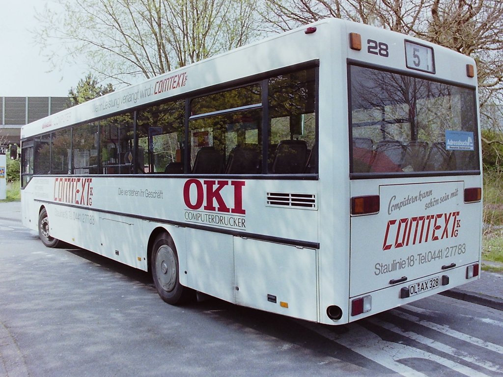 Wagen 28. Im Sommer 1992 war der Bus geringfügig verändert worden. Statt in blau  star-computerdrucker , stand nun in rot  oki-computerdrucker  auf dem Bus. Dieses Bild mit der geöffneten Tür gewährt einen Blick auf die Technik des Hubliftes. Die im Bild noch knapp erkennbare Stufe verschwand im ersten Schritt unter dem Podest auf dem der Fahrer saß. Die untere Ebene fuhr heraus, fungierte als Rampe und ermöglichte so die Auffahrt auf den eigentlichen Lift. Nach dem Liftvorgang konnte der Rollstuhl in den Passagierbereich fahren und die einzelnen Baugruppen des Liftes fuhren in ihre Ausgangspositionen zurück.