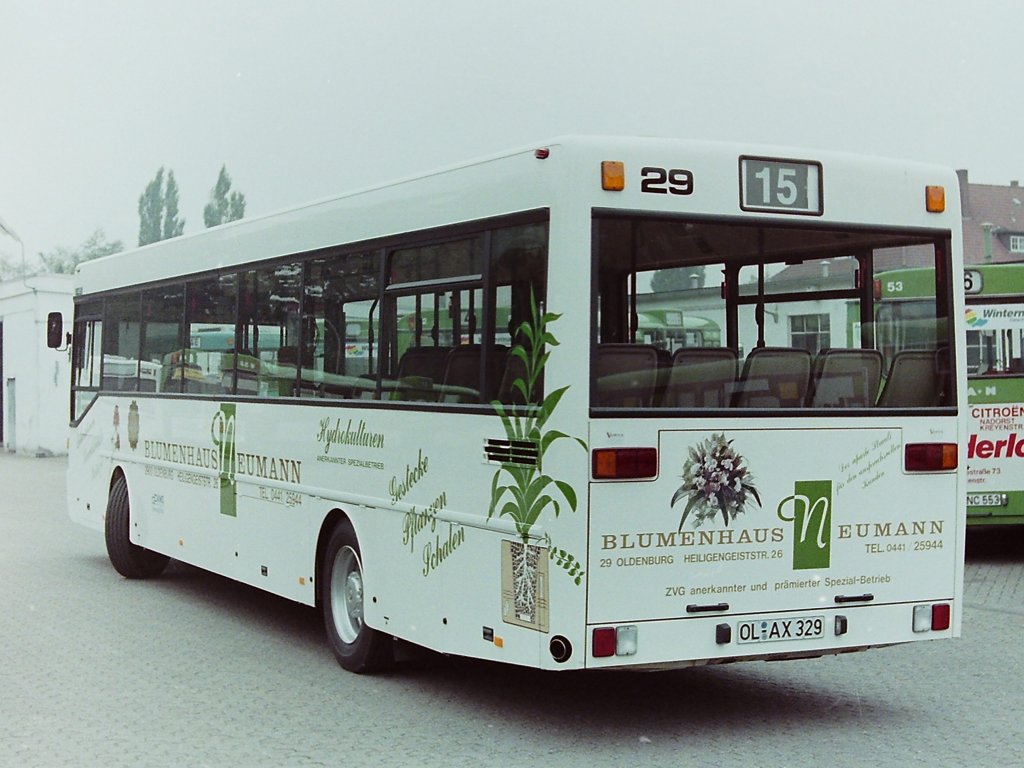 Wagen 29. Hier der Gegenschuß zu dem ersten Foto. Auch bei dieser Lackierung war nur zaghaft von der normalen Werbefläche abgewichen worden. Auch die letzten beiden Busse dieses Jahrganges bekamen Vollwerbung, aber dazu später ...