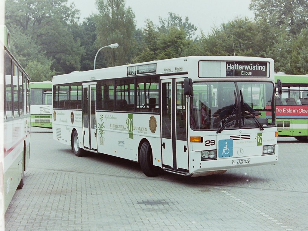 Wagen 29, OL-AX 329, Bj. 1989. Wesentlich freundlicher für das Auge als auf Wagen 38, präsentierte sich das Blumenhaus NEUMANN mit der neuen Lackierung auf Wagen 29. Hans-Joachim Luckau war hier im September 1989 so freundlich den Bus aus der Parkposition zu manövrieren, um Bilder machen zu können. Unterhalb der vorderen Tür sind auf diesem Bild gut Teile der Vorrichtung des Hubliftes zu erkennen.