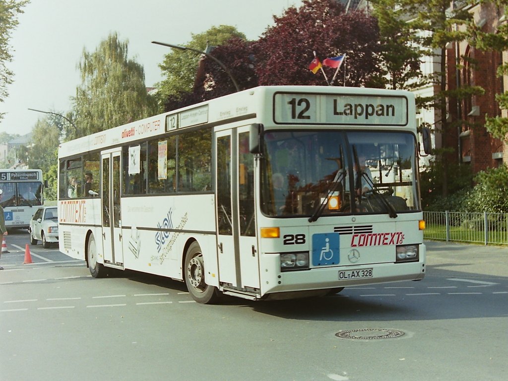 Wagen 28. Im Sommer 1992 war der Bus geringfügig verändert worden. Statt in blau "star-computerdrucker", stand nun in rot "oki-computerdrucker" auf dem Bus. Dieses Bild mit der geöffneten Tür gewährt einen Blick auf die Technik des Hubliftes. Die im Bild noch knapp erkennbare Stufe verschwand im ersten Schritt unter dem Podest auf dem der Fahrer saß. Die untere Ebene fuhr heraus, fungierte als Rampe und ermöglichte so die Auffahrt auf den eigentlichen Lift. Nach dem Liftvorgang konnte der Rollstuhl in den Passagierbereich fahren und die einzelnen Baugruppen des Liftes fuhren in ihre Ausgangspositionen zurück.