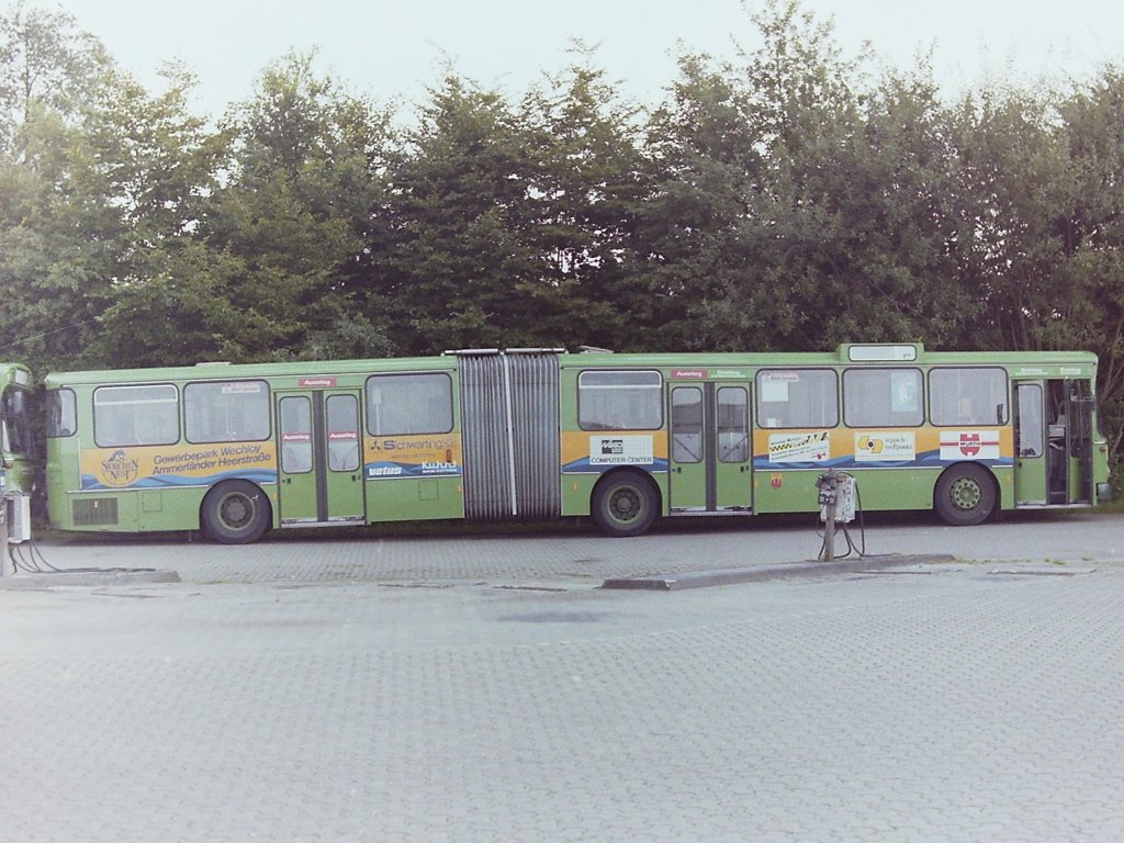 Wagen 30, OL-AX 330, EZ: 1989. Dieses Bild passt zwar nicht so ganz in die Reihe der letzten gezeigten Bilder, aber ich habe versprochen danach zu suchen und es ggfs nachzureichen. Das tue ich hiermt. Unter der Bild.Nr.: 155850 hatte ich den Bus bereits von der Türseite mit Heckansicht präsentiert und mich dabei selber gewundert, von diesem Bus keine weiteren Bilder zu haben. Hier nun das Fahrzeug mit der wirklich auffälligen Vollwerbung in der Frontansicht. Die Aufnahme entstand in den ersten Arbeitstagen des Busses im Oktober 1989 an der Endstation der Linie 4 RENNPLATZ in der Kurlandallee.